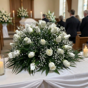 Esta corona es perfecta para acompañar ceremonias fúnebres, misas o velatorios, ofreciendo un gesto de solidaridad y respeto hacia la familia. Su tamaño y diseño están pensados para ser una pieza central en cualquier espacio, destacando por su sobriedad y belleza.