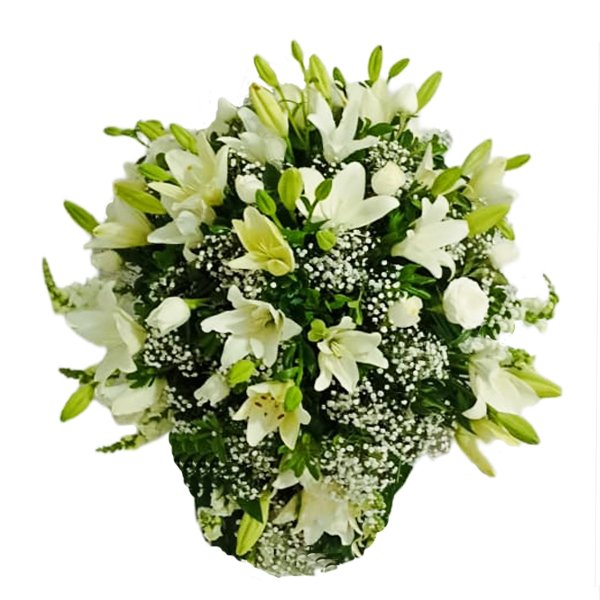 Expresamos nuestras condolencias y respeto a través de este delicado diseño floral, elaborado con amor y cuidado por nuestros expertos diseñadores. Cada detalle ha sido pensado para transmitir serenidad y acompañar a sus seres queridos en un momento tan significativo.