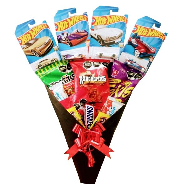 “Este Ramo Turbo Hot Wheels exclusivo fusiona la adrenalina de Hot Wheels con la dulzura de tus golosinas favoritas. Los vibrantes y detallados autos de colección emergen de entre una colorida variedad de dulces, como si estuvieran compitiendo en una carrera de sabores. Envueltos en papeles llamativos y decoraciones inspiradas en pistas de carreras, los chocolates, caramelos y gomitas rodean cada automóvil, creando un sorprendente contraste entre la velocidad y la dulzura. Ideal para los fanáticos de los autos y los golosos, este ramo es una opción innovadora y deliciosa que acelera el corazón y despierta el apetito.”