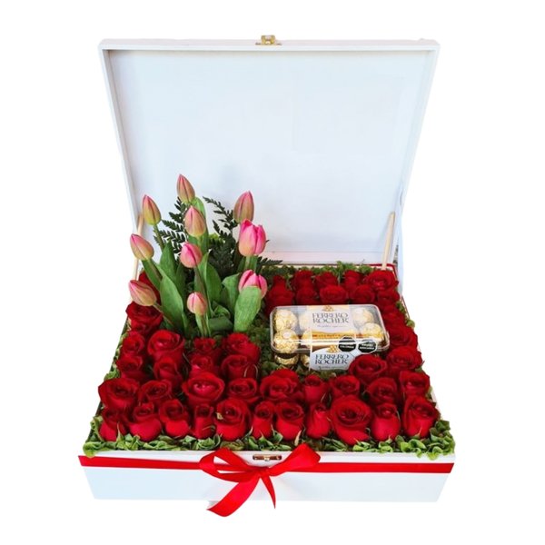 Descubre el encanto de nuestra caja de tulipanes de amor que contiene 10 tulipanes y 50 hermosas rosas rojas, un regalo perfecto para expresar emociones en cualquier ocasión. Con sus vibrantes colores y elegancia natural, este arreglo floral ha sido cuidadosamente elaborado para transmitir belleza, amor y sofisticación.